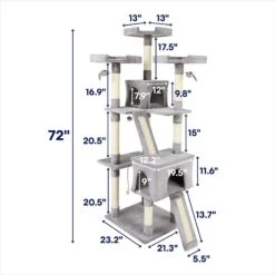 - This 33.5-inch vertical tower is the ideal height for stretching and provides a perch that’s high off the ground so they can keep an eye on their territory.
