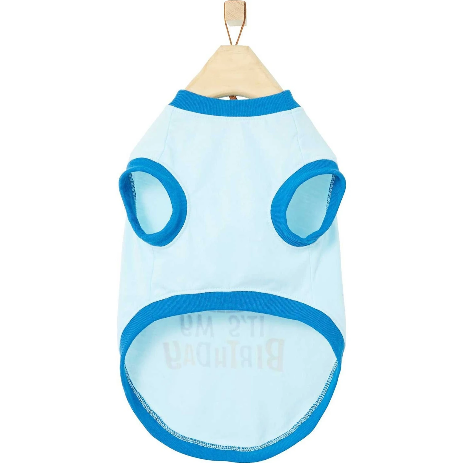Remember to measure your pet for the paw-fect fit. Your pet can feel extra special on their big day with the Frisco It’s My Birthday & Cat T-Shirt. This lightweight t-shirt is made with a breathable cotton-polyester blend and features an adorable blue “It’s My Birthday” print. The pull-over style makes it easy to get your pet dressed—so they can be the center of attention! Plus, it’s machine washable and comes in different sizes to fit most pups and kitties.