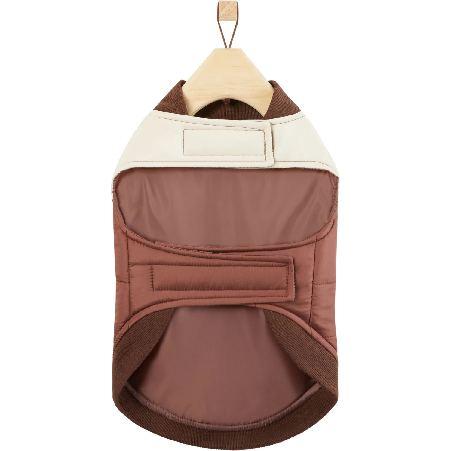 • From Frisco by Chewy. Your furry friend’s style just got a bit bolder with this colorblock puffer jacket.