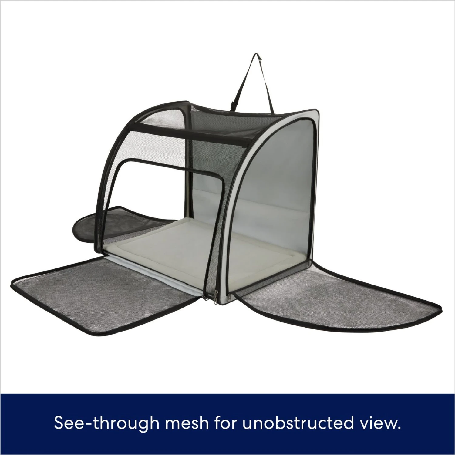 Frisco Travel Safety Dog & Cat Carrier, Large—Honk that horn, check those mirrors and let that tongue flap in the wind, because it’s time for a road trip! Riding with comfort and safety takes a backseat to nothing unless it’s this travel car seat carrier from Frisco by Chewy! In just three simple steps, your dog will be ready to travel everywhere with the fam. Simply loop the straps around the headrest, push the anchors through the seat gaps and pass the seat belt through the seat belt path. Done and done. Oh, and it’s also got mesh sides so that your canine companion can take in the awesome scenery that zooms by. When the trip is over, the carrier can fold flat for easy storage until it’s time to hit the road again.